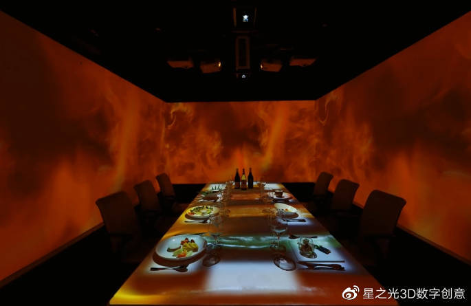 全息投影餐廳采用先進的投影技術與人體感知技術,制作出一張以沉浸式西餐為主的智能全息餐桌。